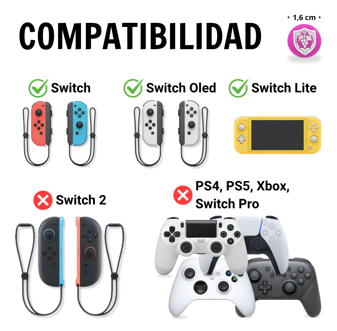 Nuestros thumb grips son compatibles con Switch 1, Lite, Oled. No son compatibles con PS5, PS4, Xbox, Switch 2.